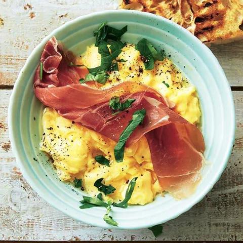 En middag behöver inte vara knepigare än att vispa ihop lite ägg med lyxiga tillbehör. Äggröran får här dessutom lyxig krämighet av crème fraiche. Servera med lufttorkad skinka eller något annat salt tillbehör.