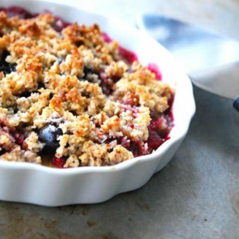 En god och lättgjord smulpaj med banan, hallon och blåbär som bas.