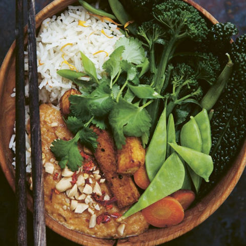 En bowl fylld med tofu, morot, broccoli och sockerärter som toppas med en supergod jordnötssås. Recept är taget ut kokboken Värmande vego av Karolina Jönsson.