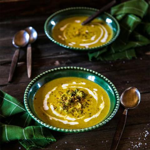 - Kör soppan slät med en mixerstav och mixa i creme fraichen. Ställ tillbaka soppan på plattan och smaka upp med äppelcidervinäger, chiliflakes, ancho chilipulver samt mer salt och peppar om det behövs. Låt soppan puttra ihop någon minut och rör sedan i purjolök och den urtagna broccolin.