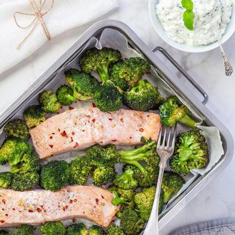 Denna lax- och broccoliplåt går inte bara snabbt att tillaga, rätten är också rik på vitaminer och omega 3-fetter. Rätten serveras med fetaoströra smaksatt av basilika och fulländar på så vis maträtten.
