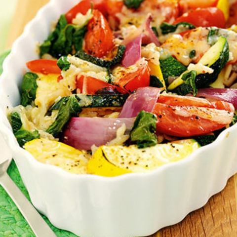 - Blanda de stekta grönsakerna med tomat, paprika och spenat i en ugnsfast form och strö över osten. Stick ner citronklyftorna i gratängen. Gratinera högt upp i ugnen cirka 5 minuter så att osten smälter och får lite gyllene färg.