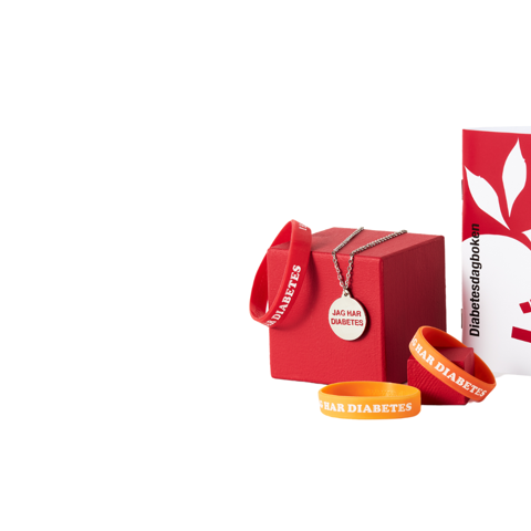 Vi har ett diabetesarmband och ett diabeteshalsband som visar att du har sjukdomen om något som skulle hända dig. Vår praktiska diabetesdagbok hjälper dig att hålla koll på ditt blodsocker och vad du äter. Eftersom diabetessjukdomar ofta innebär många frågor har vi även tagit fram ett antal broschyrer med viktig information till dig som fått en diagnos.