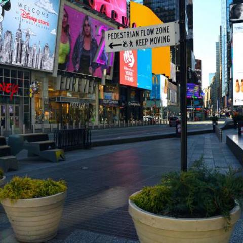 New York, staden som aldrig sover, tycks alltså till sist tycks ha slumrat in. Times Square är fullkomligt öde, och tar man en promenad i teaterdistriktet ekar det tomt dag som natt. Posten levererar paket, poliser finns utspridda här och där, och visst kan man se någon enstaka bil, men det är väldigt glest mellan fotgängarna. En av de få platser där man se en folkgrupp, förutom på sjukhusen, är om man försöker sig på att storhandla mat. Populära matkedjor som Trader Joe’s har långa köer som ringlar sig runt kvarteret fråm morgon till kväll, och Wholefoods har stängt igen de flesta kassorna och släpper bara in några personer åt gången för att förhindra trängsel. Individerna köar ordningssamt med en människolängds avstånd mellan varandra, och de flesta har på sig mask och plasthandskar. Öppettiderna ändras utan varsel för att kunna fylla på med mat, och mataffärer liksom bankkontor stänger och öppnar igen beroende på om någon anställd varit i kontakt med en smittad eller blivit sjuk själv, så de måste sanera lokalen. Vissa bankkontor har bara onlinetjänster och andra har dragit ner på utbudet och erbjuder endast det mest basala tjänsterna såsom insättningar, betalningar och uttag.