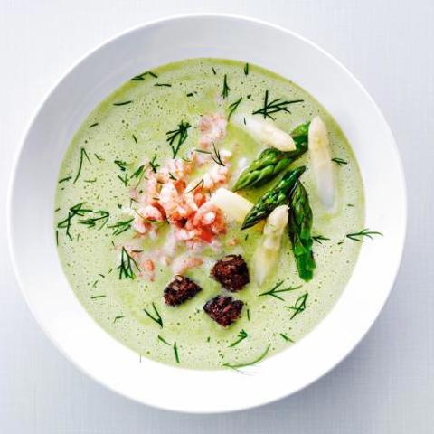 - Servera soppan med sparrishuvuden, räkor, rostade rågbrödstärningar och dill.
