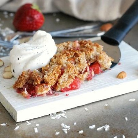 Fräsch jordgubbspaj toppad med ett knaprigt lager kokstäcke!
